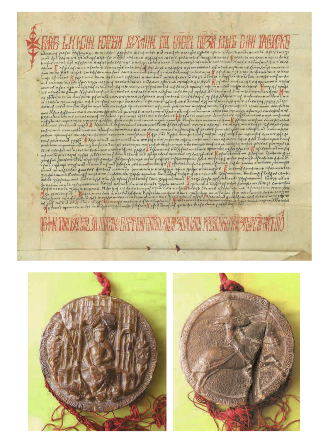 А СВЕМУ ОВОМЕ КЛЕТВЕНИЦИ И СВЕДОЦИ СУ НАШЕ ДОБРЕ ВЕЛМОЖЕВОЈВОДА ИВАНИШ ПАВЛОВИЋ С БРАТИЈОМ, ВОЈВОДА ТВРТКО СТАНЧИЋ С БРАТИЈОМ, ВОЈВОДА ВЛАДИСАВ КЛЕШИЋ С БРАТИЈОМ, ВОЈВОДА СЛАДОЈЕ СЕМКОВИЋ С БРАТИЈОМ, ВОЈВОДА ПЕТАР, ПАВЛА ЈУРЈЕВИЋА СИН, С БРАТИЈОМ, КНЕЗ ЈУРАЈ ДРАГИЋЕВИЋ С БРАТИЈОМ, КНЕЗ ВУКИЋ ВЛАТКОВИЋ С БРАТИЈОМ, КНЕЗ ОСТОЈА СТИПОЈЕВИЋ С БРАТИЈОМ, А ПРИСТАВ ОД ДВОРА НАШ ДВОРСКИ КНЕЗ СТИПАН ВЛАТКОВИЋ С БРАТИЈОМ, ПРОТОВЕСТИЈАР НАШЕГ КРАЉЕВСТВА КНЕЗ РЕСТОЈЕ С БРАТИЈОМ. НАЈПРЕ, ЗАРЕКОХ СЕ ЈА ПОМЕНУТИ ГОСПОДИН КРАЉ ТОМАШ И С ВЕЛМОЖАМА КРАЉЕВСТВА МИ, НАПРЕД НАВЕДЕНИМ, ПОЛОЖИВШИ РУКУ НА СВЕТО ЈЕВАНЂЕЉЕ И НА ЧАСНИ КРСТ ХРИСТОВ ДА ЈЕ УТВРЂЕНО И НЕОСПОРИВО ГРАДУ ДУБРОВНИКУ СВЕ ШТО ПИШЕ У ОВОМ ЗАПИСУ У ВЕКЕ ВЕКОВА. А ОВО СЕ ПИСА ТРЕЋИ ДАН МЕСЕЦА СЕПТЕМБРА 1444. ГОДИНЕ ОД РОЂЕЊА ХРИСТОВА НА КРЕШЕВУ И ЗАПОВЕДИСМО ГА ПЕЧАТИТИ НАШИМ ЗАКОНИТИМ ВИСЕЋИМ ПЕЧАТОМ. ЈА, РЕСТОЈЕ ПРОТОВЕСТИЈАР ЗАПИСАХ ПО ЗАПОВЕСТИ ГОСПОДИНА МИ КРАЉА ТОМАША, А ПИСА СЕ У СЛАВНОМ ГРАДУ У КРЕШЕВУ.