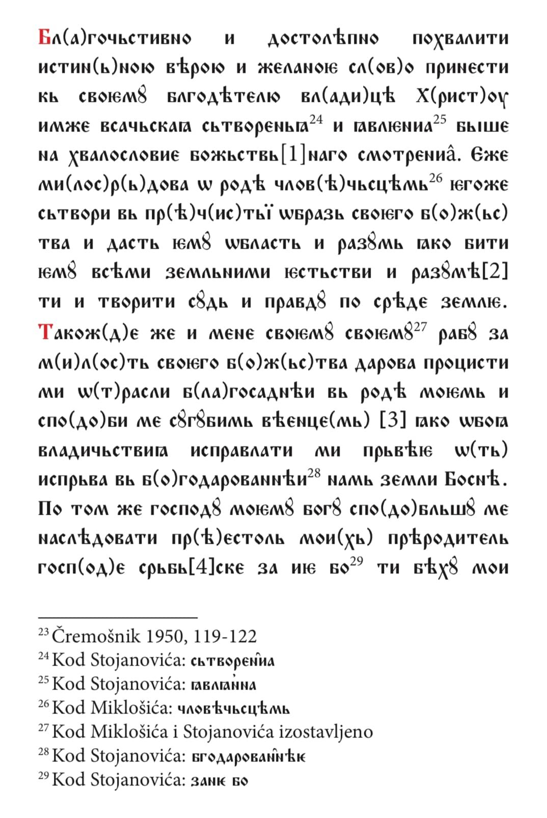 ПОБОЖНО [ЈЕ] И ДОСТОЈНО ПОХВАЛИТИ ИСТИНСКОМ ВЕРОМ И ЖЕЉЕНУ РЕЧ ПРИНЕТИ СВОЈЕМУ ДОБРОТВОРУ ВЛАДИЦИ ХРИСТУ, ОД КОГА СВЕ СТВОРЕНО И ОБЈАВЉЕНО БИ НА ПОХВАЛУ БОЖА[1]НСКОГ ПРОВИЂЕЊА, КОЈЕ СЕ СМИЛОВА ЧОВЕЧИЈЕМ РОДУ, КОЈЕГА СТВОРИ ПРЕМА ПРЕЧИСТОМ ЛИКУ СВОЈЕГА БОЖАНСТВА, И ДАДЕ МУ ВЛАСТ И РАЗУМ, ДА БУДЕ [НАД] СВОМ ЗЕМАЉСКОМ ТВАРИ И ДА РАЗУМИ[2]ЈЕ И ТВОРИ СУД И ПРАВДУ ПОСРЕД ЗЕМЉЕ. ТАКОЂЕ ЗАТИМ И МЕНИ, СВОМЕ РОБУ, ЗА МИЛОСТ СВОГА БОЖАНСТВА, ДАРОВА ДА МИ ПРОЦВЕТА ИЗДАНАК ПЛЕМЕНИТО УКОРЕЊЕНИ У РОДУ МОЈЕМУ И УДОСТОЈИ МЕ ДВОСТРУКИМ ВЕНЦЕМ [3] КАКО БИХ ОБИМА ГОСПОДСТВИМА УПРАВЉАО, ПРВО ИСПРВА У БОГОМДАНОЈ НАМ ЗЕМЉИ БОСНИ, ПОТОМ ПАК ГОСПОД МОЈ БОГ МЕ ПОЧАСТИО ДА НАСЛЕДИМ ПРЕСТО ПРАРОДИТЕЉА МОЈИХ, ГОСПОДЕ СРП[4]СКЕ, ЗАТО ЈЕР ТИ МОЈИ ПРАРОДИТЕЉИ, У ЗЕМАЉСКОМ ЦАРСТВУ ЦАРСТВОВАВШИ, И НА НЕБЕСКО ЦАРСТВО ПРЕСЕЛИЛИ СЕ БЕШЕ. ЈА, ПАК, ВИДЕВШИ ЗЕМЉУ СВОЈИХ ПРЕДАКА ОСТАВЉЕНУ НАКОН ЊИХ И ДА НЕМА СВОГ [5] ПАСТИРА, ОДОХ У СРПСКУ ЗЕМЉУ, ЖЕЛЕЋИ И ХТИЈУЋИ ОСНАЖИТИ ПРЕСТО РОДИТЕЉА МОЈИХ. И ТАМО ИШАВШИ КРУНИСАН БЕХ ОД БОГА ДАРОВАНОМ МИ КРУНОМ НА КРАЉЕВСТВО ПРАРОДИТЕЉА МОЈИХ, [6] ДА БУДЕМ У ХРИСТУ ИСУСУ ПОБОЖАН И ОД БОГА ПОСТАВЉЕНИ СТЕФАН, КРАЉ СРБИМA И БОСНЕ И ПРИМОРЈА И ЗАПАДНИМ СТРАНАМА.