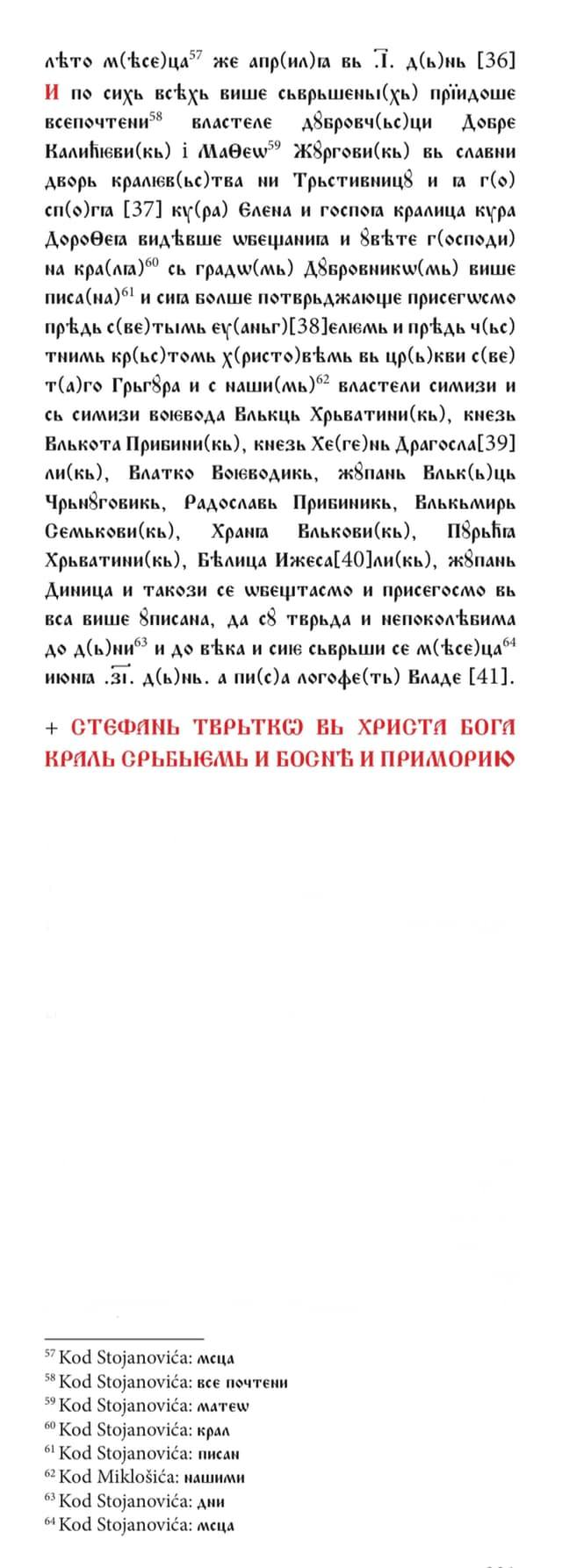 And after all this promise [26] my kingdom with the God-given kingdom of my mother, Mrs. Kira Jelena and Mrs. Queen Kira Dorothea and the chosen nobleman of my kingdom, [27] and there would be nobles in my kingdom: Prefect Branko Pribinić, courtier Vukosav Stefković, Dobrašin Stefanović, duke Vlatko Vuković, prince Vukašin [28] Milatović, prince Priboje Mastnović, prefect Bjelak Sanković, founder Tvrtko Vlađević, Vukac Vladisalić. And so we promise that there will be faithful and wholehearted love between the kingdom [29] and between the city of Dubrovnik and its ruler, as the great-grandparents and parents of the kingdom of Serbia [30] and Bosnia had with him. And for this word and for this justice written above, the kingdom promises me on the holy gospel and before the honorable cross of Christ and the mother of the kingdom, and with me [31] the queen and the eloquent nobleman, that this word and this promise be written firmly and steadfastly to to eternity: whoever dares to live up to this word and promise [32] of ours to which we have committed and written, let him take upon himself and on his soul those curses which we have mutually uttered before the holy gospel, and may the kingdom give me this [33] never falsify, until when the city of Dubrovnik and the nobles of Dubrovnik falsify this and by some unbelief they and their children and their heirs lose. And I also pray for [34] reading, whoever God puts after me on the throne of my kingdom, not to confirm this, but moreover, to better fulfill and confirm it and to strengthen it better. And this promise [35] and writing records and confirming the kingdom in front of the city of Dubrovnik in Žrnovnice in the year after the birth of Christ in 1378 in April 10th day. [36] And after all that was done, the venerable nobles of Dubrovnik Dobre Kalićiević and Mateo Žurgović came to the glorious court of our kingdom in Trstivnica, and I Mrs. [37] Kira Jelena and Mrs. Queen Kira Dorothea, seeing the promises and conditions of Mr. King with the city of Dubrovnik , and this is better confirmed, we swore before the holy gospel [38] and before the holy cross of Christ in the church of St. Gregory and our nobleman, with these and these: Duke Vukac Hrvatinić, Prince Vukota Pribinić, Prince Hegen Dragoslal [39], Vlatko Vojevodic, prefect Vukac Črnugović, Radoslav Pribinić, Vukmir Semković, Hrana Vuković, Purća Hrvatinić, Bjelica Ižesa [40] lic, prefect Dinica. And so we promised and swore in everything written above that it is firm and unwavering for days and forever. And this ended on the 17th day of June. And wrote the logofet of the Vlade [41].