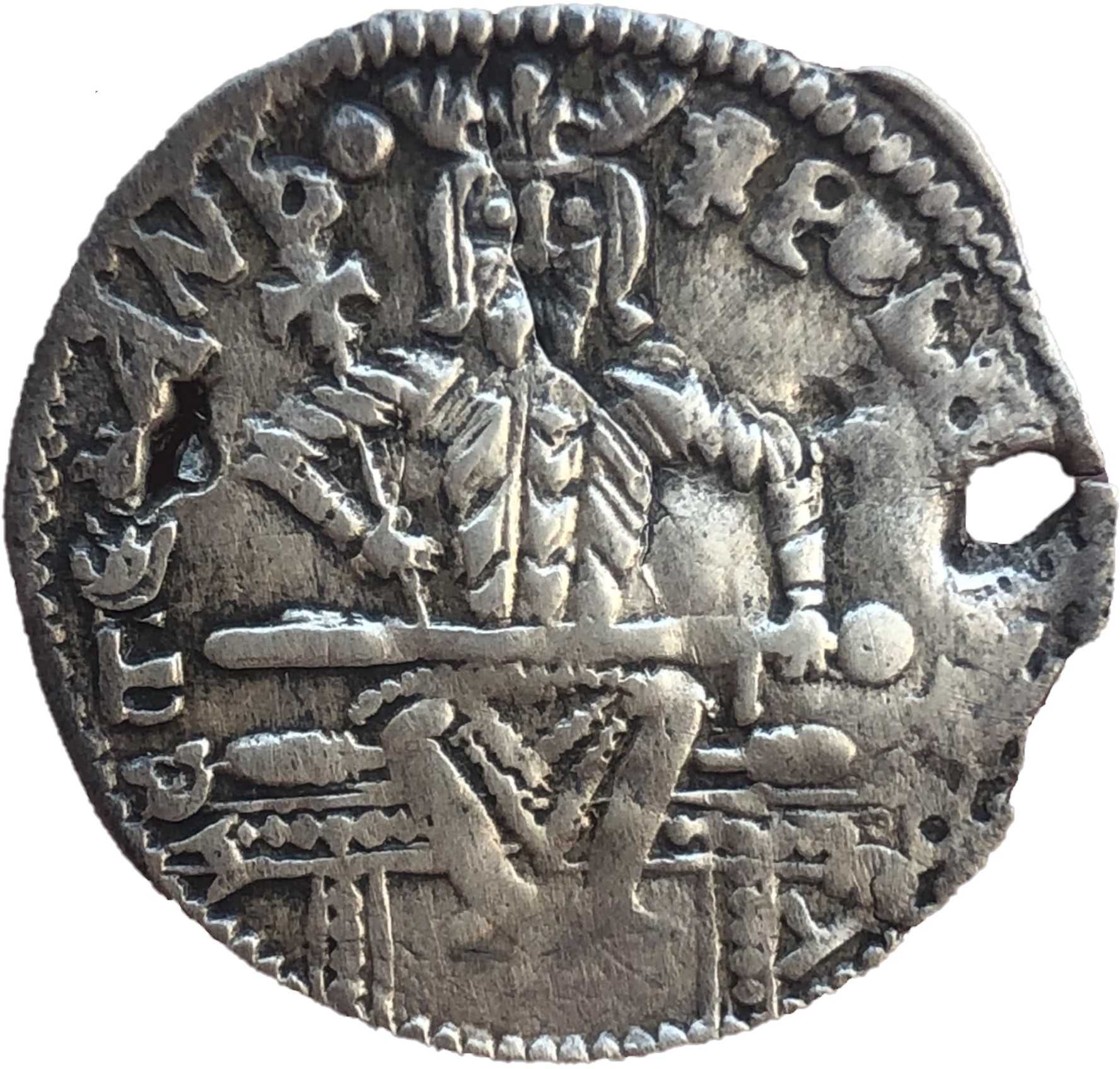 No initials on the sides like the example above possibly due to being made by a different moneyer who chose not to use moneyer marks but possibly there is a sigla S at the bottom of Jesus feet. Also long haired and bearded image of the king is featured but much slimmer body and head then example above.
