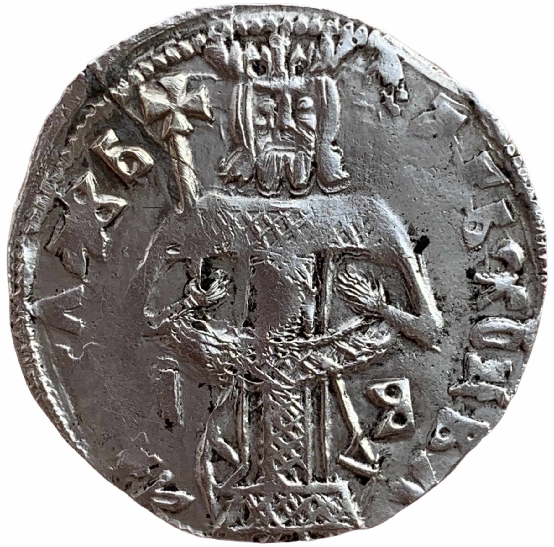 Obverse: Crowned king standing, wearing royal attire falling straight down his legs and holding smallcross tipped scepter. Serbian legend: PAB XOU ВΛb АДHСЛАВb (SERVANT OF CHRIST VLADISLAV) around.