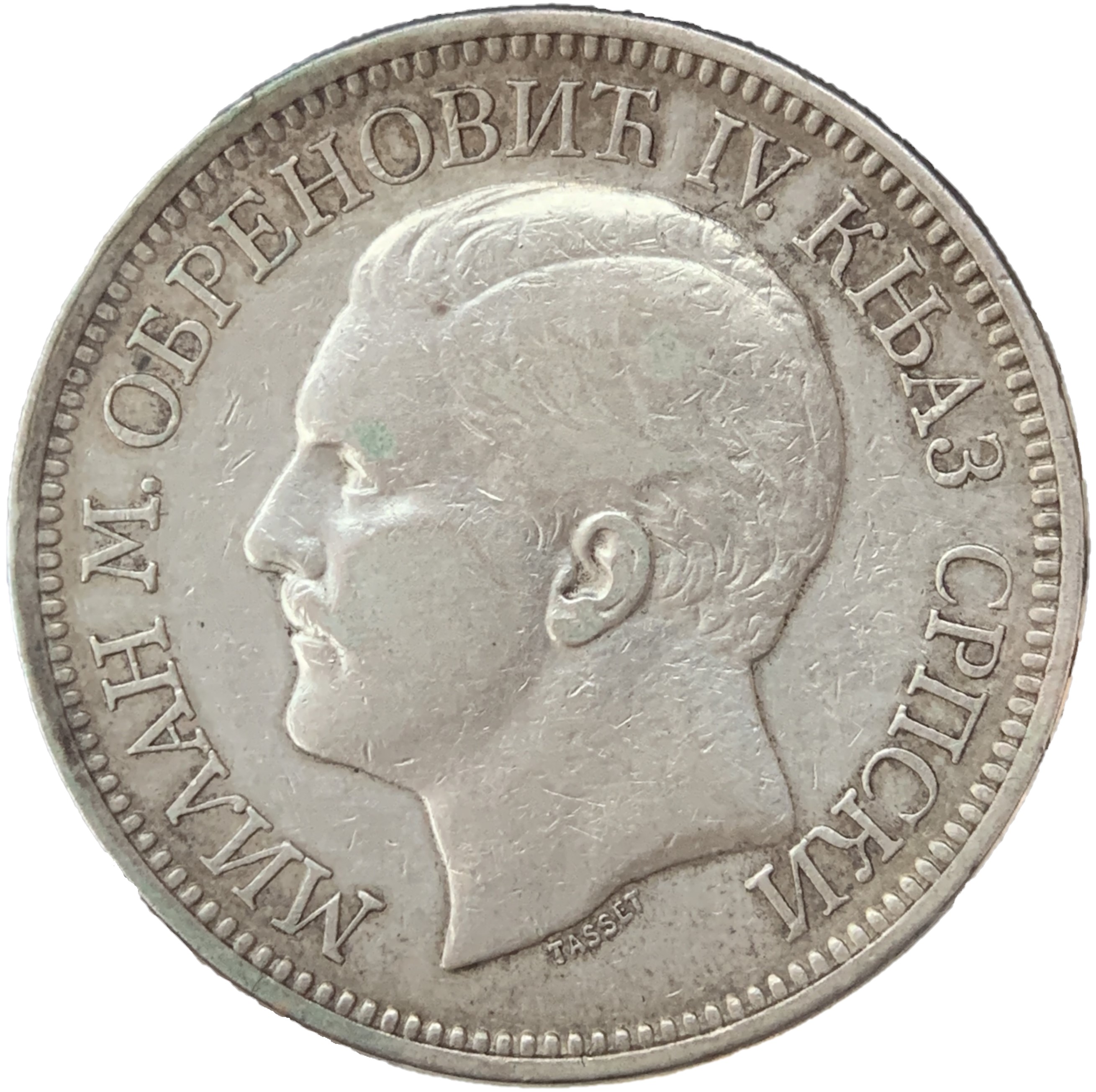 Obverse: Milan Obrenović IV facing left. Serbian legend: МИЛАН М. ОБРЕНОВИЋ IV. КЊАЗ СРПСКИ (Milan M. Obrenović IV Prince of Serbia).