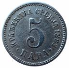 Reverse: Denomination and date within wreath, crown above. Serbian legend in 3 rows: 5 ДИНАРА 1879.