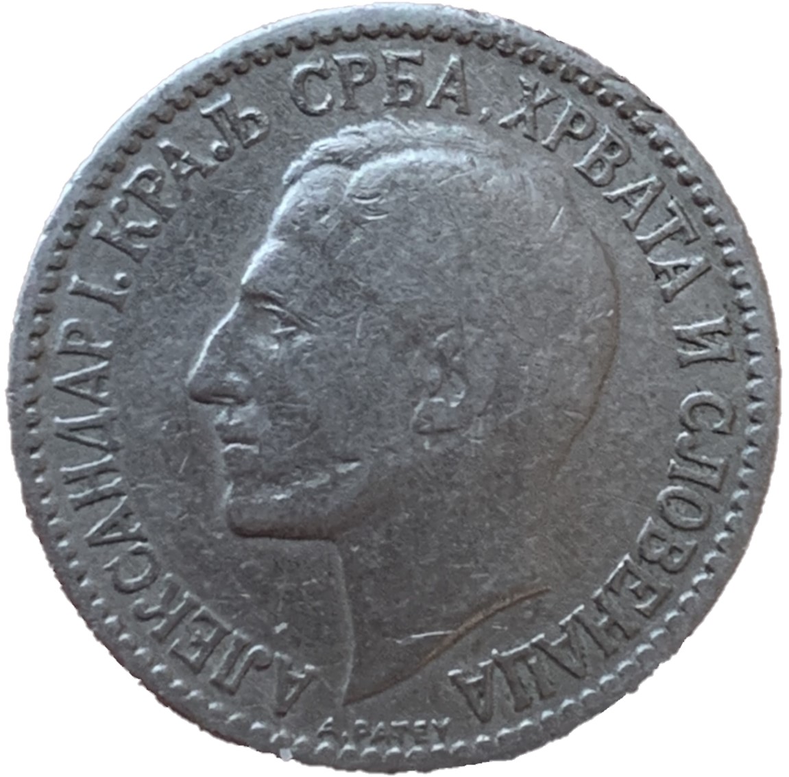 Obverse: Portrait of King Alexander I of Yugoslavia, facing left. Serbian legend: АЛЕКСАНДАР I. КРАЉ СРБА, ХРВАТА И СЛОВЕНАЦА (Alexander I, King of the Serbs, Croats, and Slovenes). A.PATEY